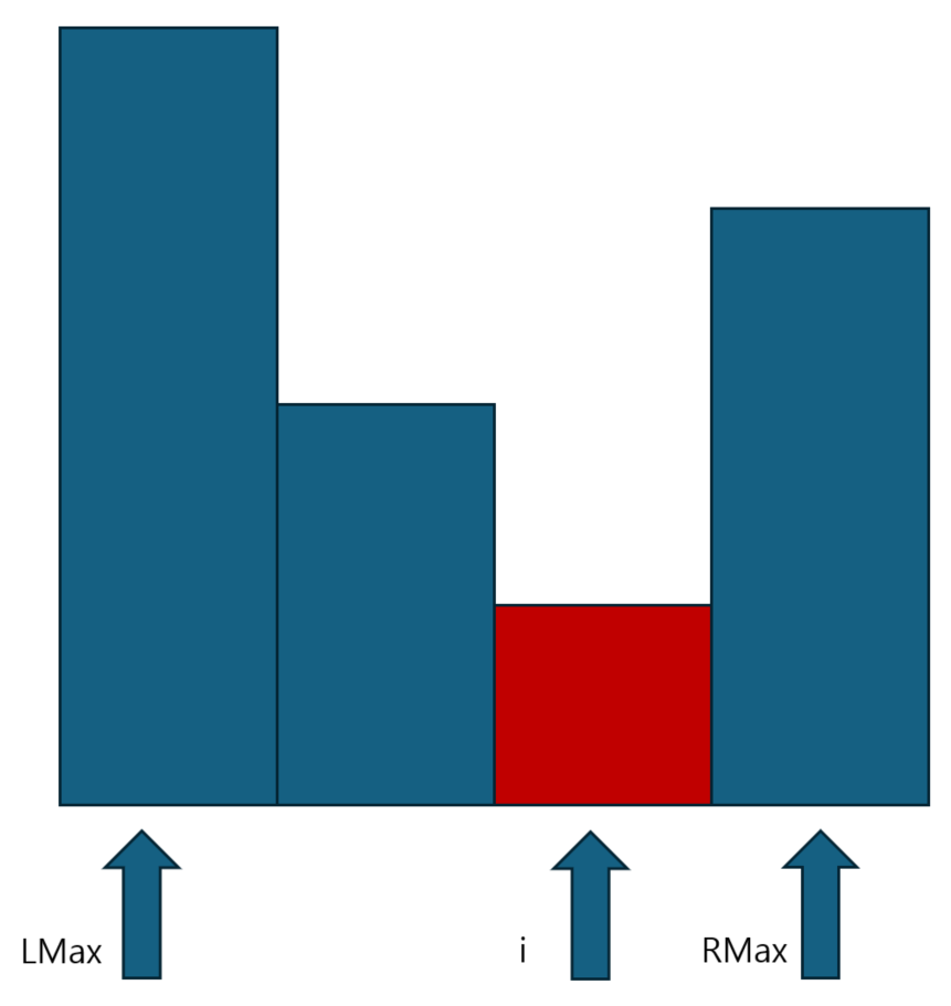 이 문제의 로직은 현재 나를 기준으로 내왼쪽에서의 최대높이와 내오른 쪽의 최대높이를 비교해서 낮은 높이를 선택 해주는 문제 였다 단 오른쪽 과 왼쪽의 최대높이가 나보다는 클때만 빗물이 받아지니 해당 상황일때만 계산하도록 코드를 작성한다 그림으로 나타내면 대충 아래와 같다