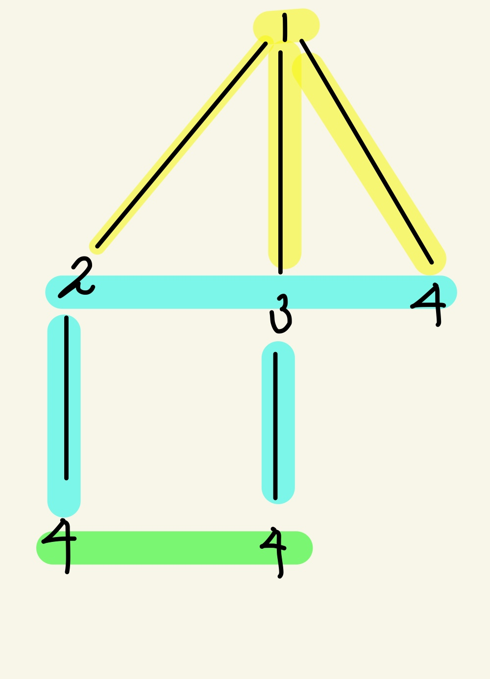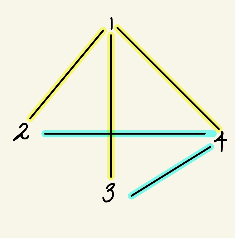 이런식으로 기준점을 1로 두고 1과 선 한개로 연결된 애들과 선을 2개로 해서 갈수 있는 애들을 나눠서 생각해줄수 있다
